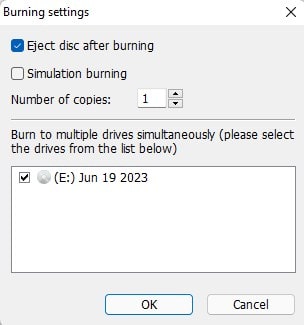 - Optionally, select burning speed. And click the “More settings” button to call up “Burning settings”, in which you can choose multiple copies and drives to ensure the simulation burning. Press “OK”.