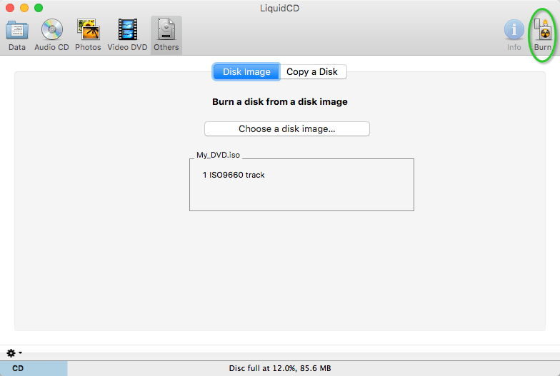 - Hit the "Burn" button to create DVD from ISO. When the disc has been burned, LiquidCD will eject it.
