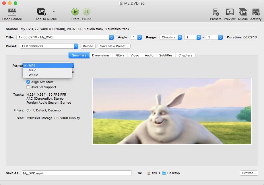 On Mac, Handbrake will display a dialog box asking you to select the source file. Browse your Mac and import the ISO. - Select MP4 as the output format under the Summary tab. You can configure other settings like video quality, FPS, audio codec, and subtitles to your liking in other tabs.