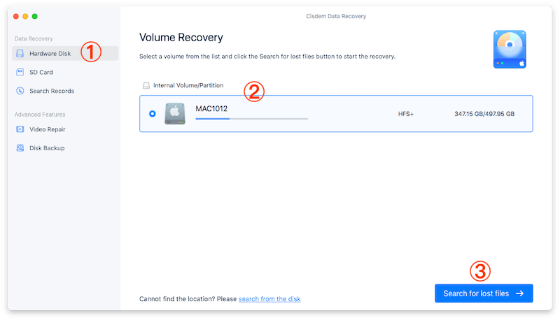 Go to Hardware Disk, choose the location where stored the lost photos on your Mac.![choose a mode]()