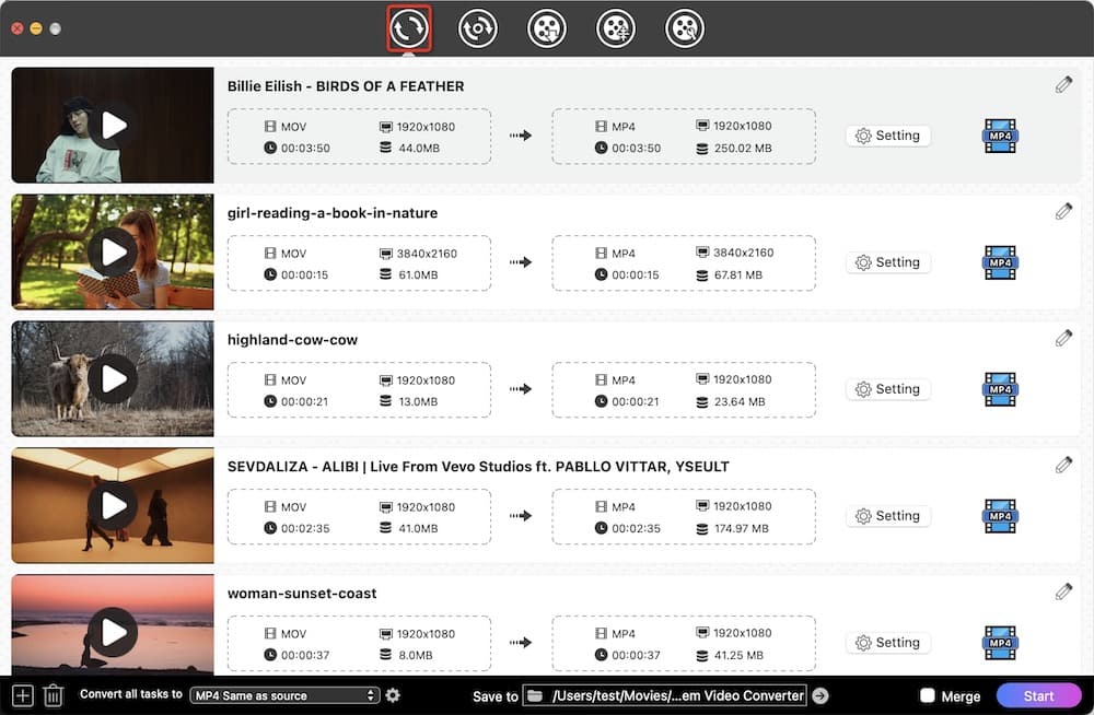 Step 1. There are 6 ways for you to upload MOV files. Generally, we add MOV files from our Mac/PC or URL. It will show the file sizes of your videos.