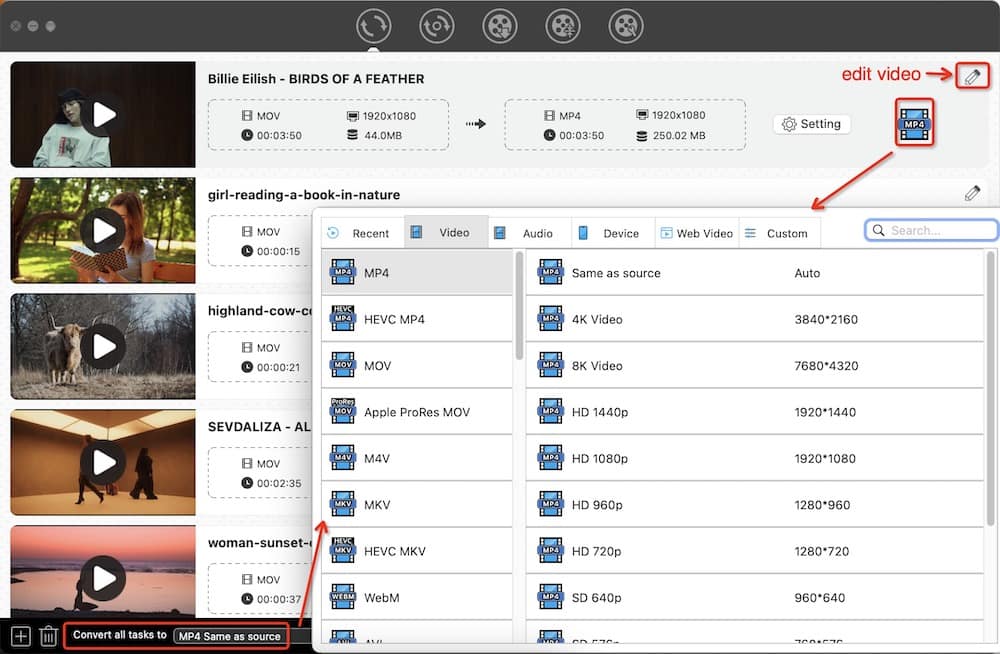 Click the format icon, it will pop out a window showing a good deal of formatting options. Choose a suitable format such as MP4 that can be played on your Mac.