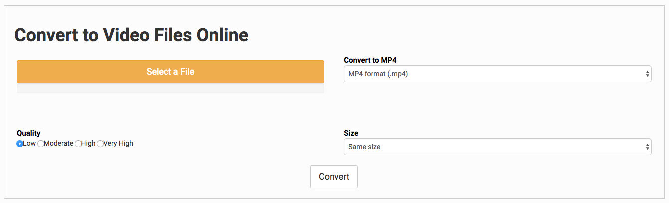Files-Conversion is an easy online service with a variety of output formats, including MP4, FLV, MPG, SWF, MOV, WMV, GIF, etc. When your computer cannot play MOV files, change the video to suitable format. The web-based tool features options for selecting quality from low to very high and file size from 320*240 to 1920*1080.