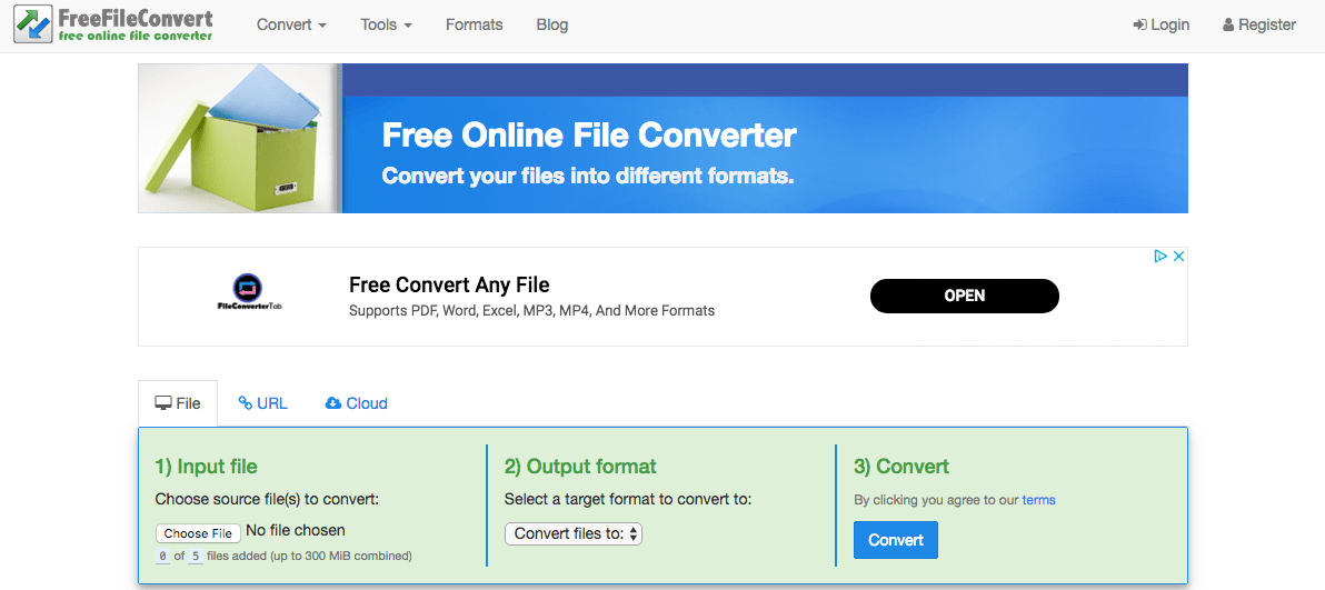 FreeFileConvert is exceptionally convenient to convert files between formats of certain file types. It supports an array of files like videos, audios, CAD, images, vectors, presentations, etc. With a simple to understand interface, the program finishes the MOV converting in few clicks and is appropriate for those users who dislike the download-and-install procedure. Moreover, it comes packed with additional features of batch conversion, which enables 5 MOV files added and up to 300 MB combined.