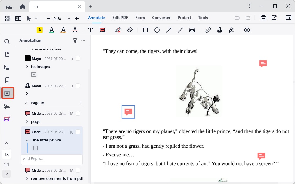 - Open the Annotation panel on the left side, all the comments, highlights and markups will be displayed orderly.