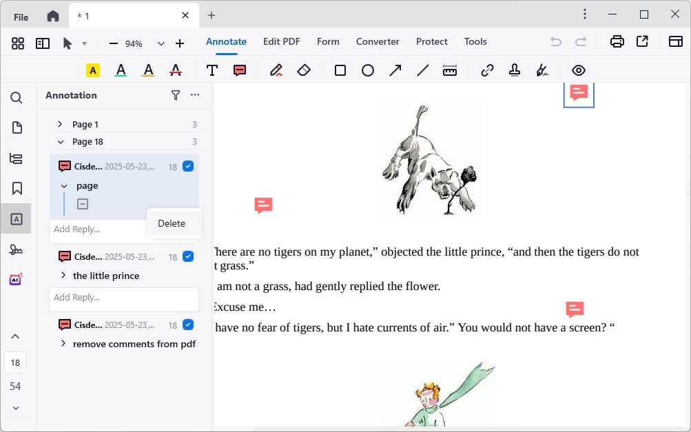 - Right click your mouse and hit Delete to remove all comments from PDF in one click.