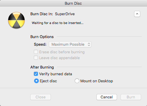 Insert a blank disc into your Mac. Choose “File” > “Share” > “File”. The File dialog box will show up.