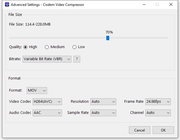 Move the slider left and right to adjust the file size. "Variable Bit Rate (VBR)" will smartly adjust the bitrate based on the complexity of the content, estimating the final file size range. "Constant Bit Rate (CBR)" will specify a fixed output file size.