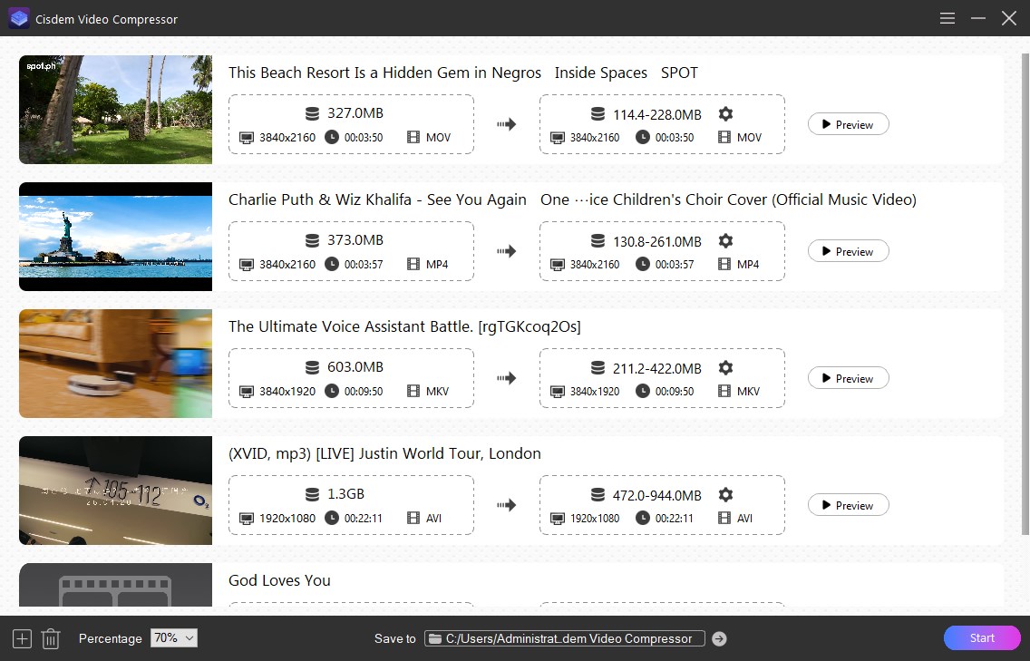 Click “Start” to make multiple video and audio files smaller in batches with lightning speed.